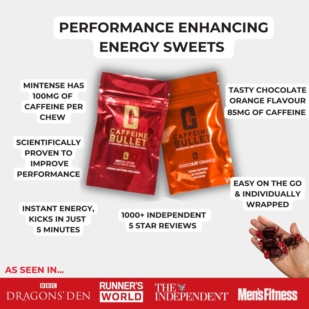 Instant motivation and energy with our full range of Caffeine Bullet products! Enhance your performance in all sports with our tasty chews that increase stamina, strength, power and focus, allowing you to push harder for longer. Chew and experience a rapid energy surge within 5 minutes, with blood caffeine levels peaking three times faster than traditional gels, pills, or drinks.
