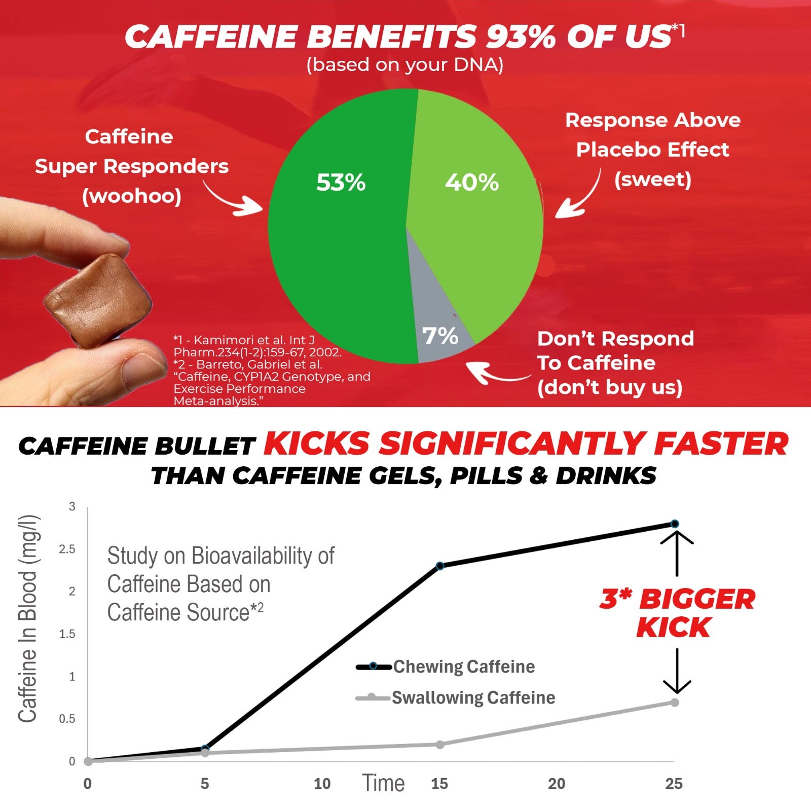 Instant motivation with Caffeine Bullet! Enhance your performance in all sports with our tasty chews that increase stamina, strength, power and focus, allowing you to push harder for longer. Chew and experience a rapid energy surge within 5 minutes, with blood caffeine levels peaking three times faster than traditional gels, pills, or drinks.