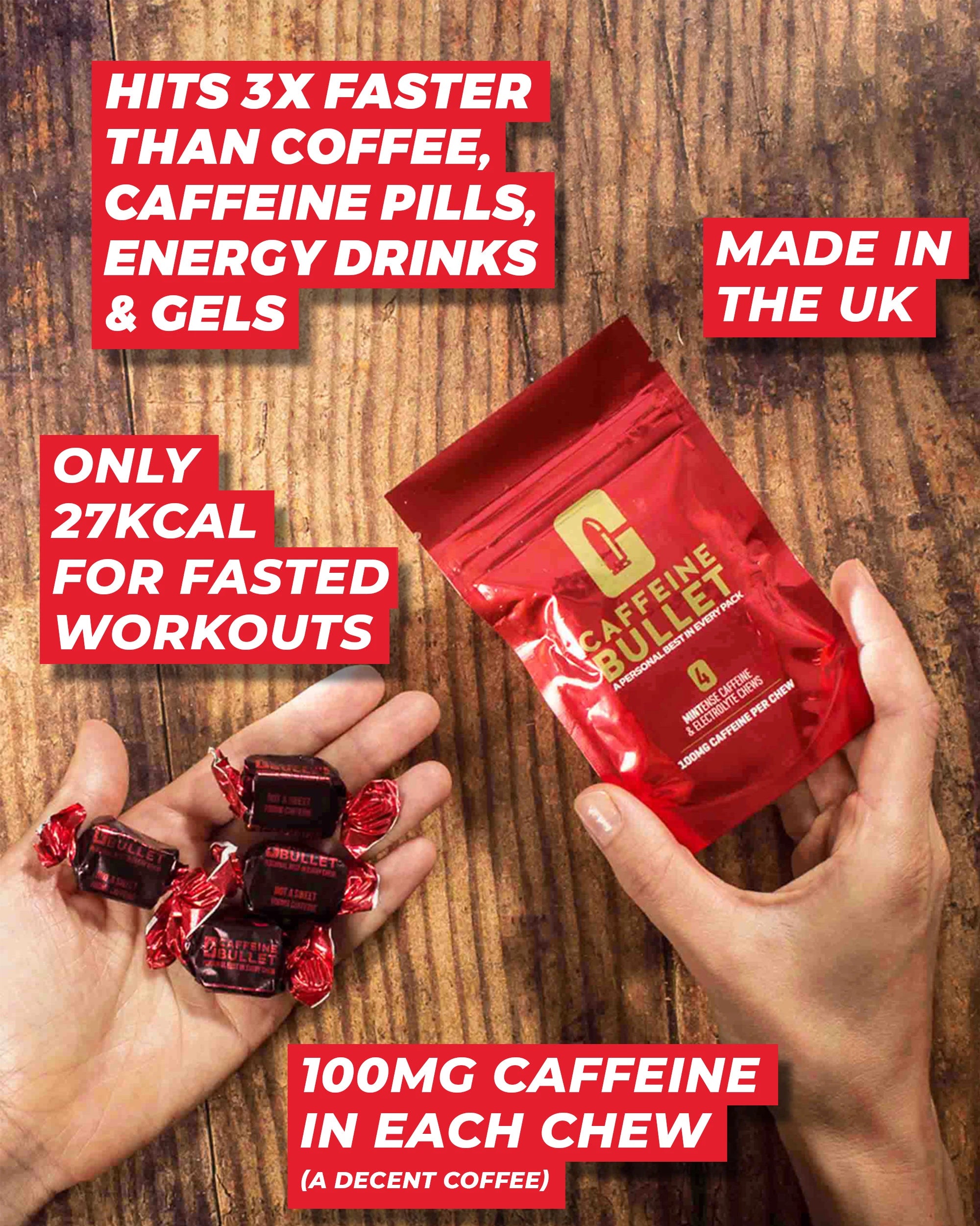 Performance enhancing Caffeine Bullets energy chews containing 100mg* caffeine per chew & are expertly designed by athletes for athletes, to kick faster than other caffeine products via buccal absorption.